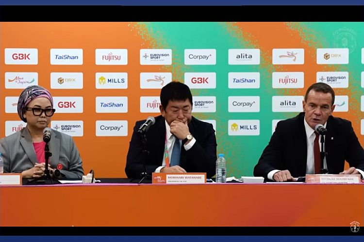 Indonesian Gymnastics Federation President Ita Yuliati, FIG President Morinari Watanabe (JPN) and Secretary General Nicolas Buompane (SUI) (l-r) at the pre-World Championships news conference on 18 October 2025 in Jakarta (Image: GymCastic podcast video screen shot).
